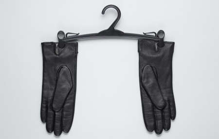 Leather gloves with a hanger on a gray background. Top view. Minimalism fashion concept