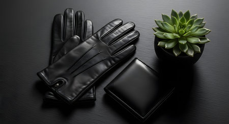 Black leather gloves with succulent plant on black background. Top view.