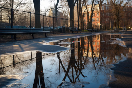 puddle reflections of damaged park structures, created with generative ai