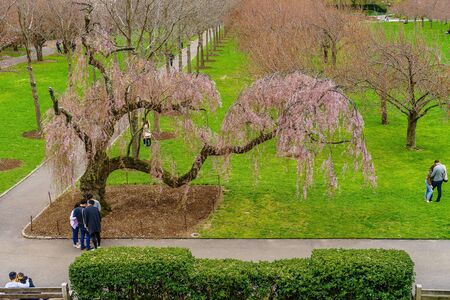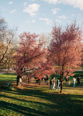 People relaxing on green lawn in sunny Central park during springtime surrounded by blooming trees and nature. New York. USA.