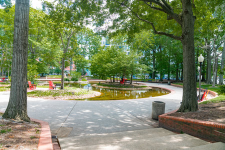 Urban Oasis in Washington DC. Peaceful city park with shade, trees, and modern buildings in the background.