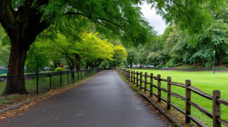 A picturesque pathway lined with vibrant green trees in a tranquil park, ideal for relaxation or outdoor activities. Embrace nature's beauty and serenity.