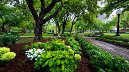A serene urban garden showcases vibrant flowers and lush greenery along a winding pathway, inviting relaxation and enjoyment of nature's beauty in a park setting.
