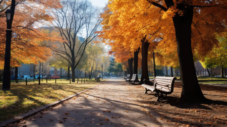 A peaceful park path lined with colorful autumn leaves and benches in a serene urban environment.