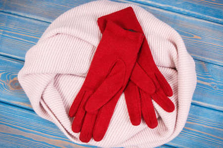 Woolen gloves and shawl or scarf for woman, warm clothing for autumn or winter concept
