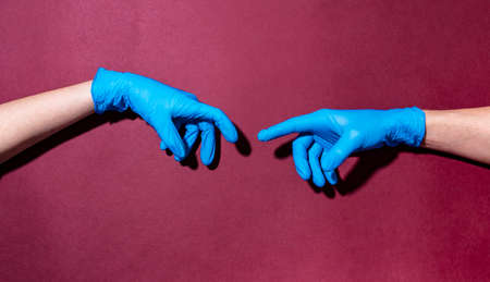 Two hands in medical gloves as a creation of Michelangelo Adam. Coronavirus pandemic. The concept of life saving. Place for text. Copy space.