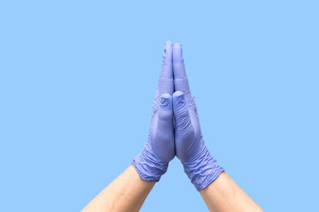 Hands in latex medical gloves folded together indicating the process of prayer. Pray about quick and easy treatment. Good cleaning. Palms isolated on blue background. Close-up. Banner. Medicine hope.
