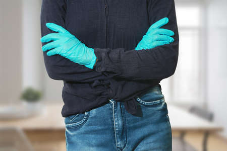 Male hands puts on black gloves indoor. Unrecognizable man in rubber gloves. Hygiene and health concept