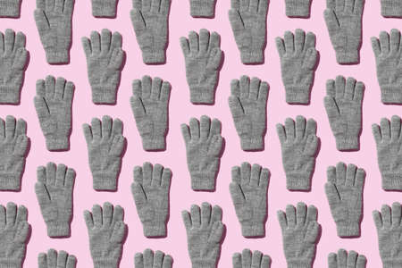 Knit winter gloves organized over pink background