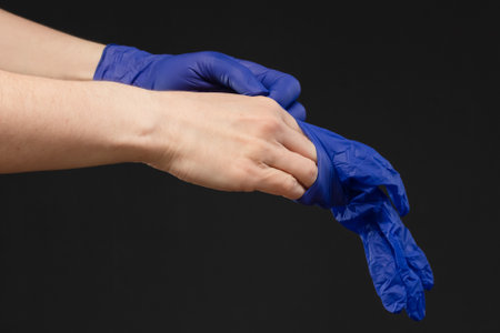 close up of man putting on a pair of blue latex gloves