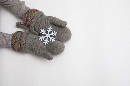 Female hands in warm knitted mittens holding snowflakes on winter background