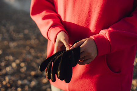 Sustainable volunteering. Volunteers donning gloves in preparation for an eco-friendly initiative.