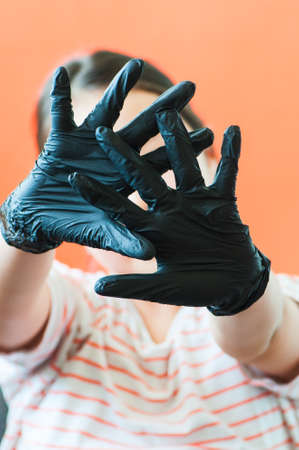 Hands with black gloves. Close up. Stop gesture or sasfety or protection concept.