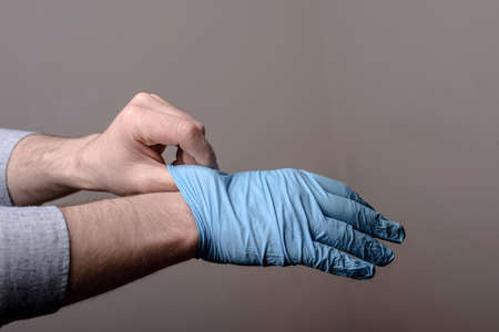 Close up hands of a young man putting on a protective gloves outdoors. Coronavirus epidemic. Concept of health and safety life. COVID-19 pandemic