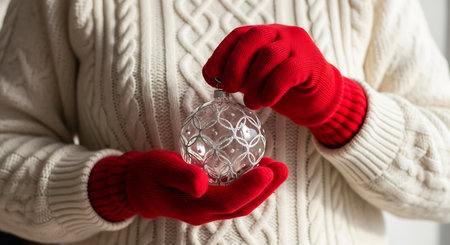Female hands in red gloves holding a glass Christmas ball. Close-up.