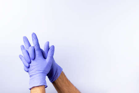 Man puts on protective rubber gloves. Purple gloves for cleaning. Flat lay. Protection of skin and hands from dirt, water, and chemicals. On a blue background. Latex. Skincare.