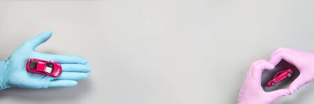 Hand in glove defend toy car. Safety insurance concept