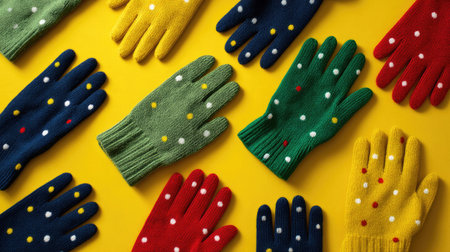 A collection of vibrant gloves featuring playful polka dots arranged artfully on a bright yellow background, perfect for showcasing fashion and winter accessories.