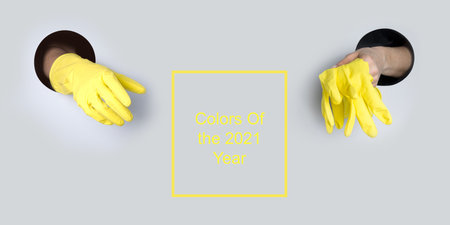 Protective yellow gloves in hand through gray paper hole. Trendy color Ultimate Gray and Illuminating of the 2021 year.