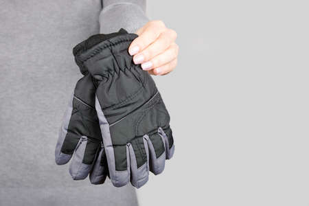 Hand with black winter gloves on grey