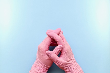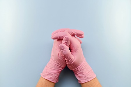 Folded hands in pink rubber medical gloves on a blue background. Closed in the castle, with closed fingers and palms pressed.