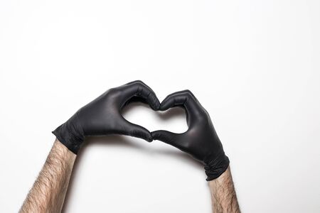 Medical glove in black on a white background. Hand showing heart sign.
