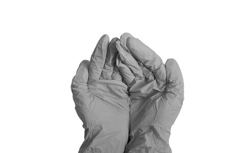 The medical worker gathered his hands in fists. On white background. Language of the body.