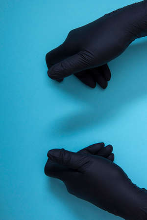 Hands with black gloves on blue background. Protection or safety concept.