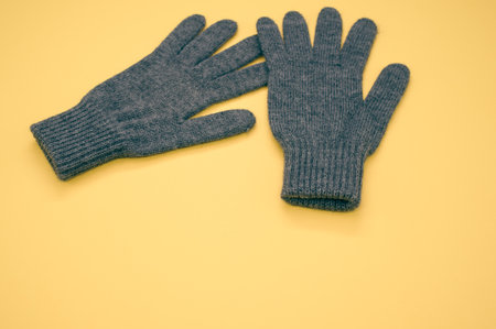 A closeup shot of gray knitted pair of gloves on a yellow background