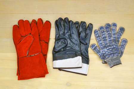 Personal protective equipment for hands at work. Peraki welder tarpaulin. Rubberized gloves. Cotton gloves.
