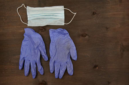 A medical face mask and blue gloves lie on a blue background. Virus protection and protection concept.