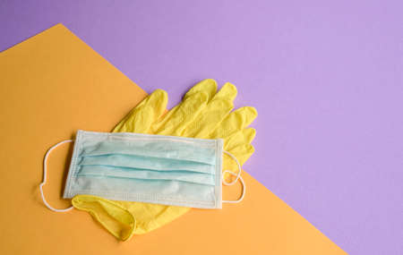 Hand gloves and medical face mask on purple and yellow background. Top view.