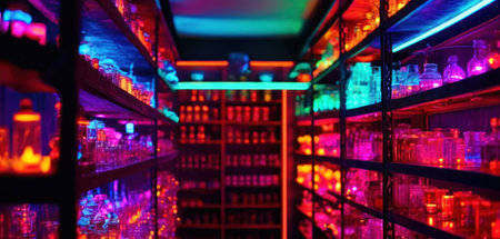 Interior of a night club with neon lights and bottles of alcoholic beverages