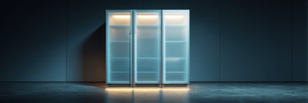 A frosty glass door refrigerator stands in a dimly lit environment, featuring glow effects that enhance its sleek and minimal design. Ideal for contemporary spaces.