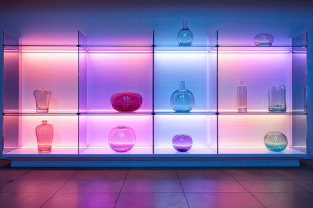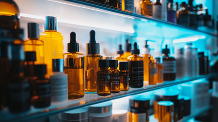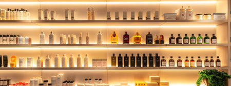 A modern display of beauty products, including bottles and containers, arranged on backlit shelves. The warm lighting highlights the elegance and premium quality of the cosmetics, ideal for luxury and high-end skincare brands.