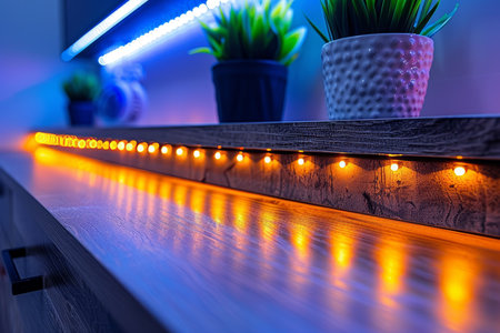 Wooden shelf against a muted wall is highlighted by a line of warm orange LED lights. The image focuses on the subtle illumination and the minimalist presentation of the shelf and lighting.
