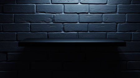 This image features a dark shelf positioned against a textured black brick wall, enhanced by soft ambient lighting, perfect for product displays or photography.