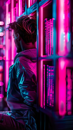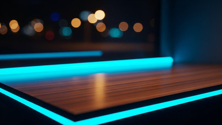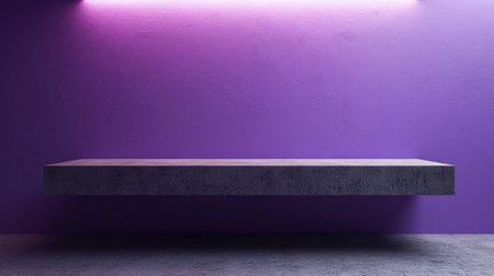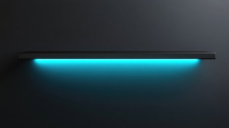 A minimalist floating shelf with a vibrant neon light creates a striking visual against a dark background, perfect for modern interior design concepts.