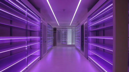A sleek and modern hallway features striking purple neon lighting that enhances the spacious design. Empty shelves line the walls, creating a tranquil and organized atmosphere perfect for contemporary interiors.