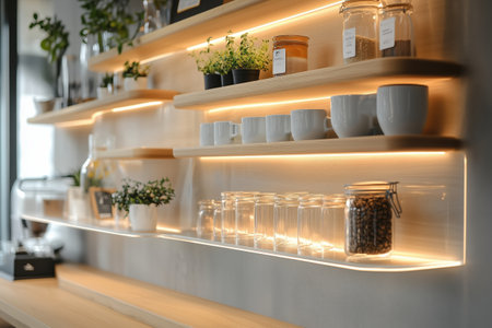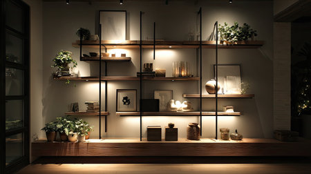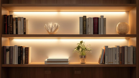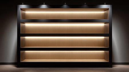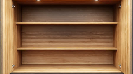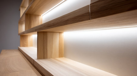 A captivating image of elegant wooden shelves illuminated softly, perfect for contemporary interior design or minimalistic storage solutions in any space.