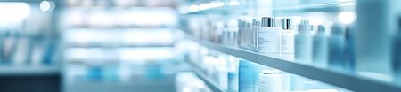 Abstract image of a showcase with medicines, cosmetics in a pharmacy