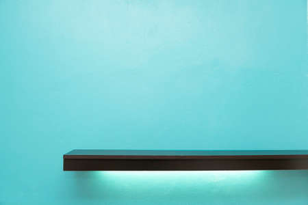 Empty white shop shelf, retail shelf with light under the shelf on blue background.