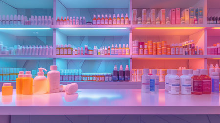 Modern pharmacy shelves filled with colorful bottles and products under vibrant lighting, representing healthcare, wellness, and pharmaceutical variety.
