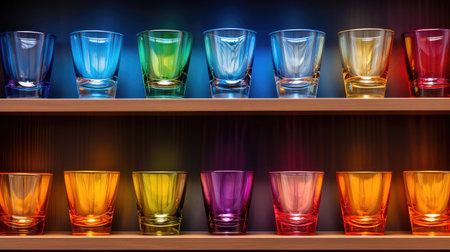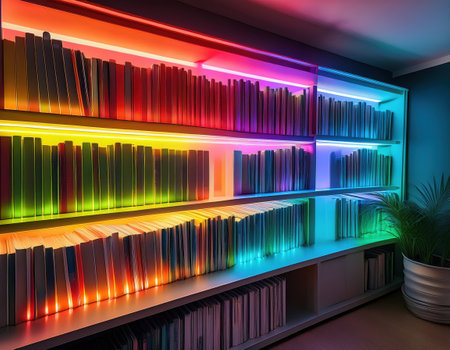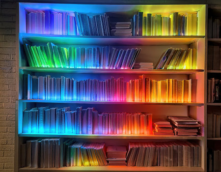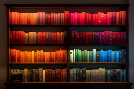 Visually striking arrangement of books organized by color on a bookshelf. Backlit for added drama, rows of colorful shelves. Generative AI