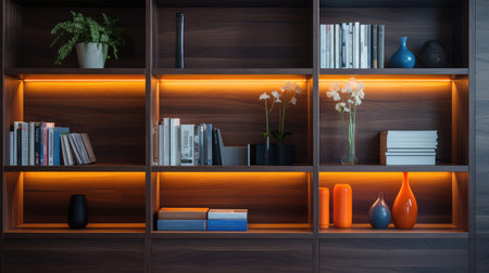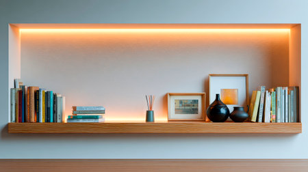This modern illuminated shelf features a minimalist design with sleek lines and warm ambient lighting, perfect for stylish home decor and creative storage solutions.