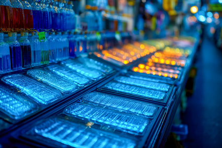A vibrant supermarket scene featuring neon-lit shelves displaying beverages with colorful reflections and a blurred perspective, evoking a modern urban vibe.