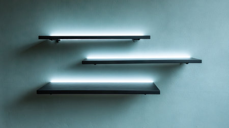 Discover the beauty of modern design with these sleek floating shelves featuring integrated LED lighting against a serene blue wall. Perfect for home decor.