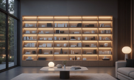 Bookcase with books and lights