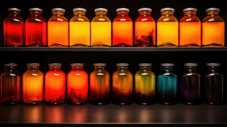 Eerie scene of glowing jars on shelves in a dark room. Mysterious and captivating storage concept.