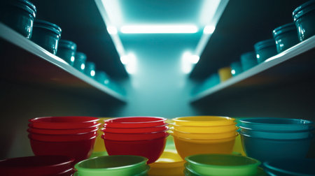Brightly colored bowls are neatly organized on modern shelves, adding a cheerful touch to the kitchen. Ideal for creative food storage or decor inspiration.